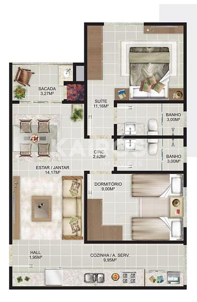 2 dormitórios (1 suíte)